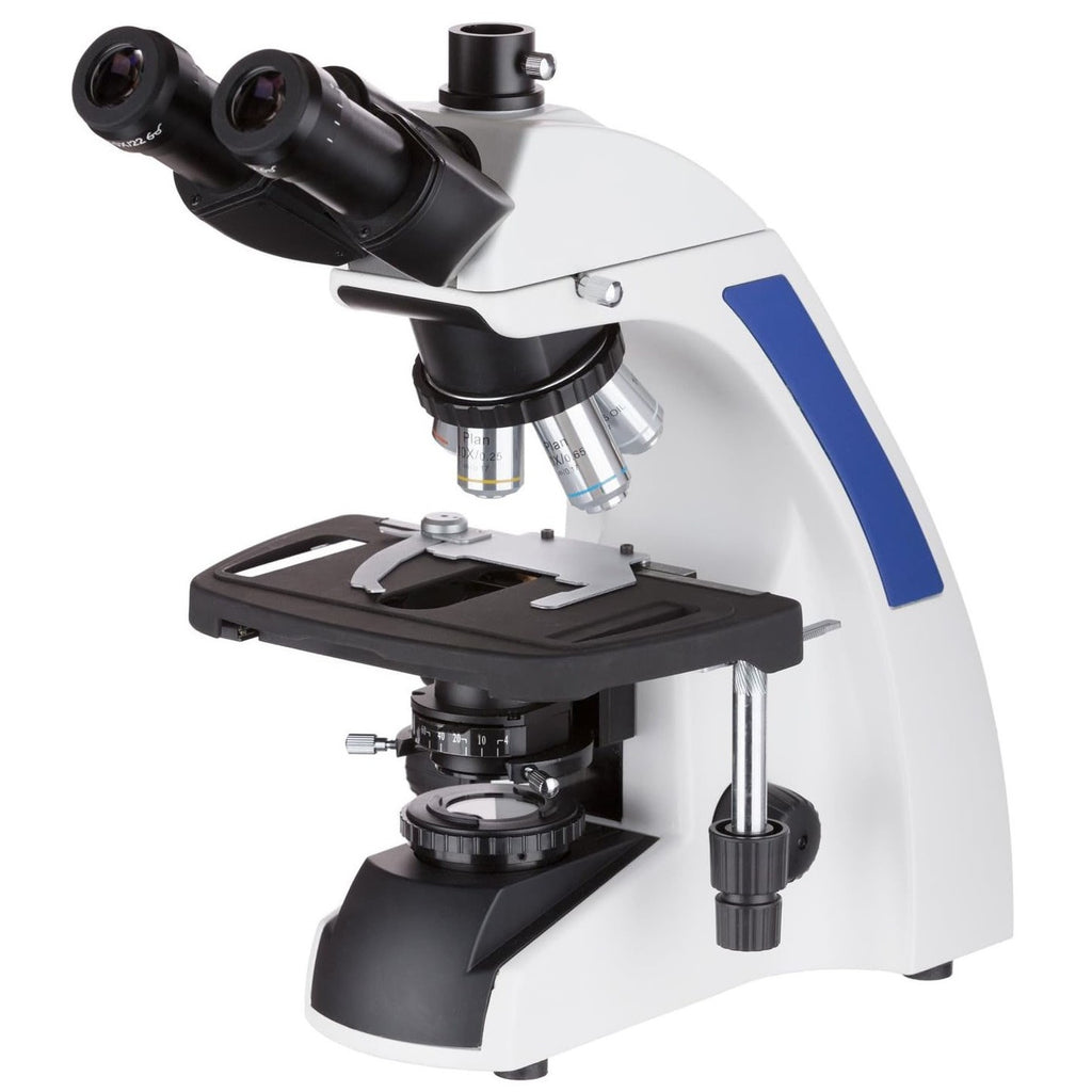 The trinocular head allows simultaneous eyepiece viewing and camera use, with a 23mm photo tube and C-mount adapter compatible with most imaging systems. Focusable, Siedentopf-style eyepieces ensure a comfortable fit for any user, including those with astigmatism.